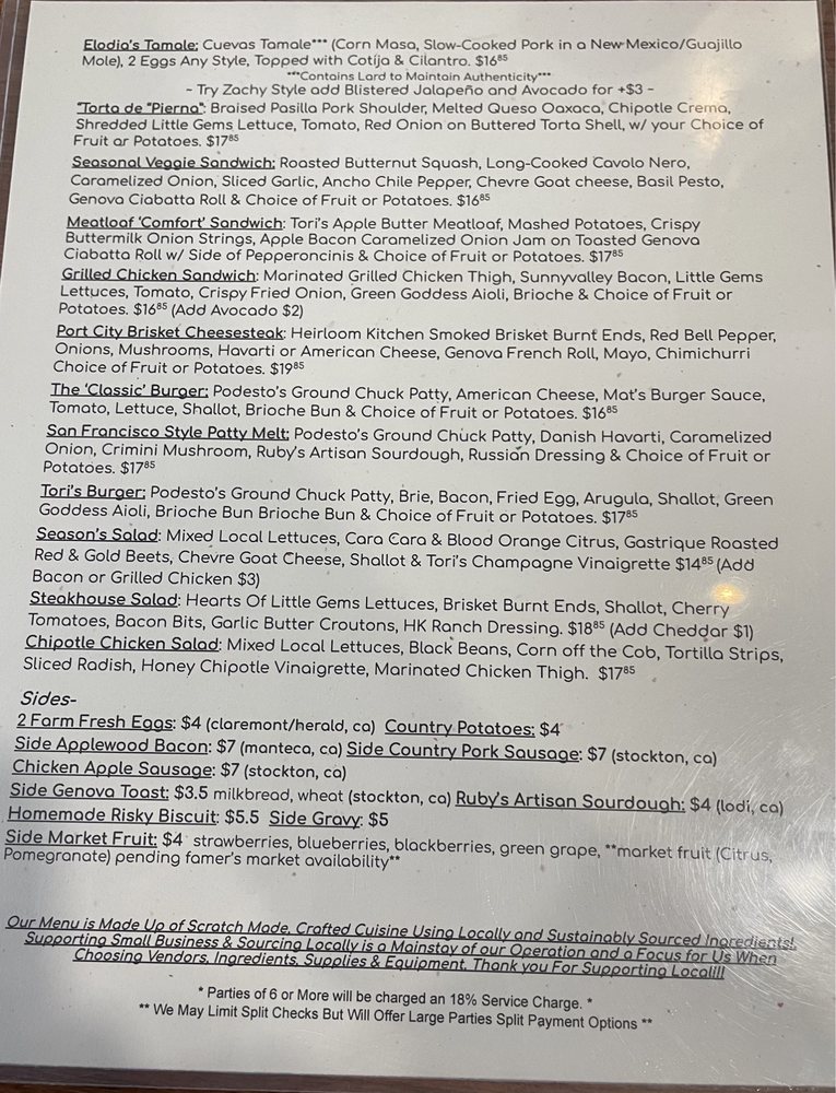 Braised Pasilla Pork Shoulder, Melted Queso Oaxaca, Chipotle Crema, Shredded Lettuce, Tomato, Red Onion on Buttered Torta Shell, w/ your Choice of Fruit or Potatoes